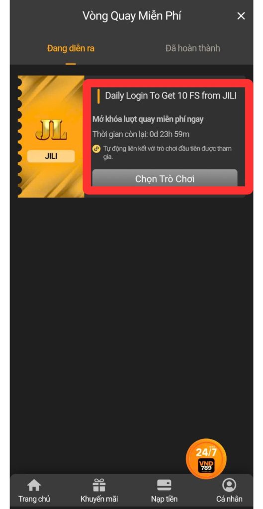 Chọn khuyến mãi, chọn trò chơi và thưởng thức Vòng Quay Miễn Phí (VQMP).